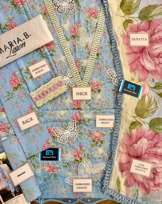 Maria b M Print MP-1D Butterfly Sky Blue Color Premium Pure Lawn With Chiffon Emb Border Duppata 2026