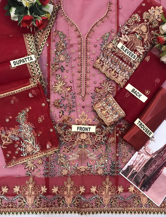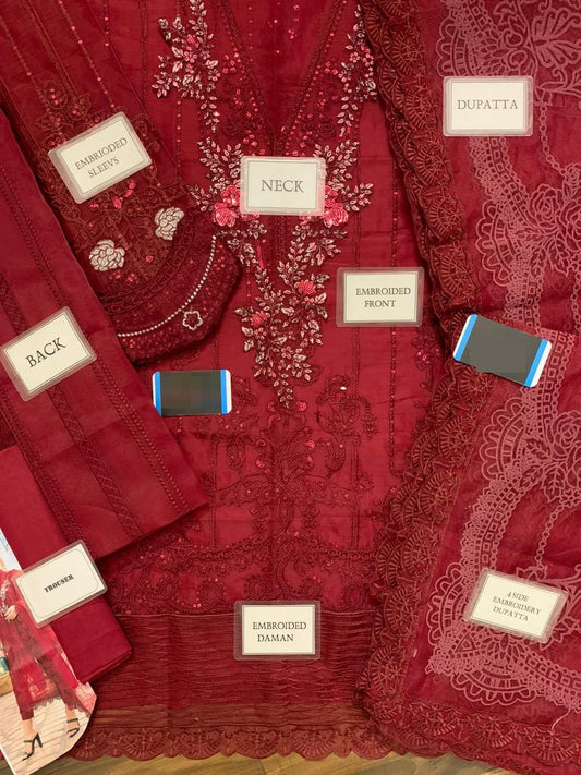 MARIA B LUXURY RED BEAUTY FULLY ORGANZA EMBROIDERED SPENGLE WORK WITH COTTON NET DUPPATA 2024