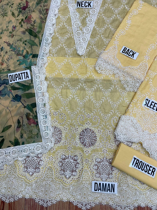 QALAMQAR SELMA PREMIUM PURE CHIKANKARI LAWN WITH HEAVY EMBROIDERED PURE ORGANZA DUPPATA 2024