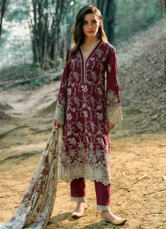 IMAGE X WEARZA MEHROON MOST DEMANDED PREMIUM PURE LAWN CHIKANKARI WITH BEAUTIFUL PURE SILK DUPPATA 2024
