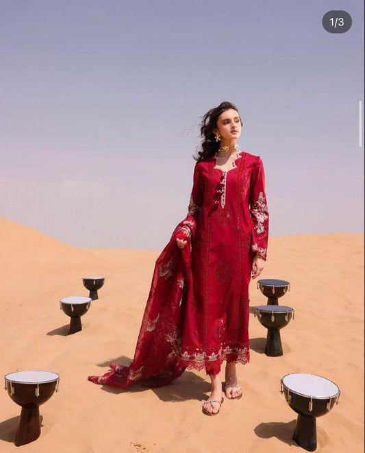 QALAMQAR RED BEAUTY PREMIUM PURE LAWN WITH ORGANZA DUPPATA 2024
