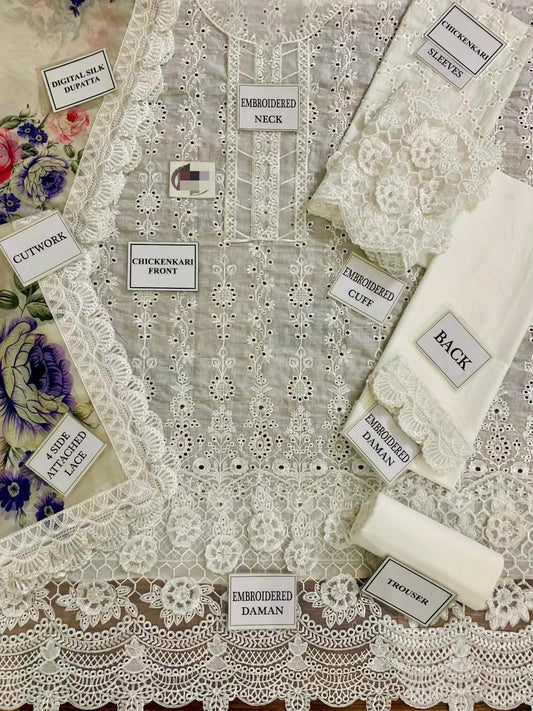 MOTIFZ PREMIUM PURE LAWN CHIKANKARI OFF WHITE MOST HOT ARTICLE WITH DIGITAL PRINTED SILK DUPATA 2024