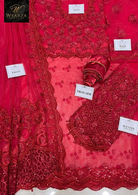 Maria-B Couture Red Beauty Saree 3D Flower Work (100% Soft Net & Silk )