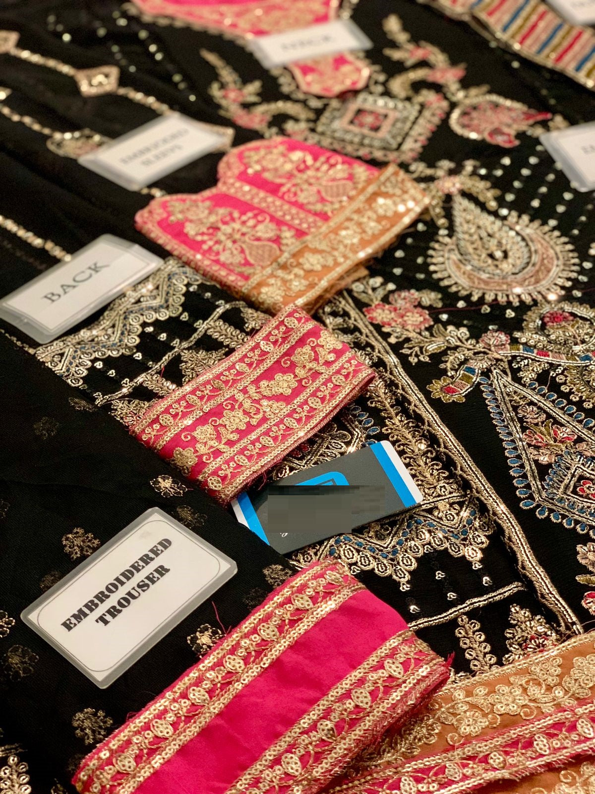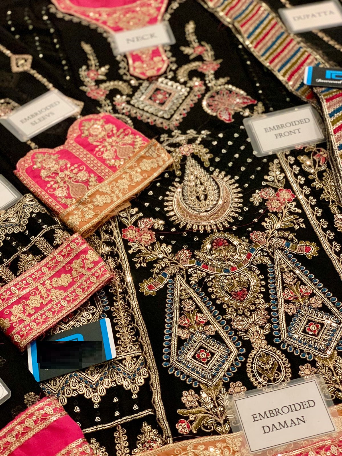 Chiffon fully heavy embroidered spangle work front center panel with fully heavy embroidered spangle work right/left panel attach with heavy embroidered spangle work neckline with 2 type heavy embroidered spangle work daman border