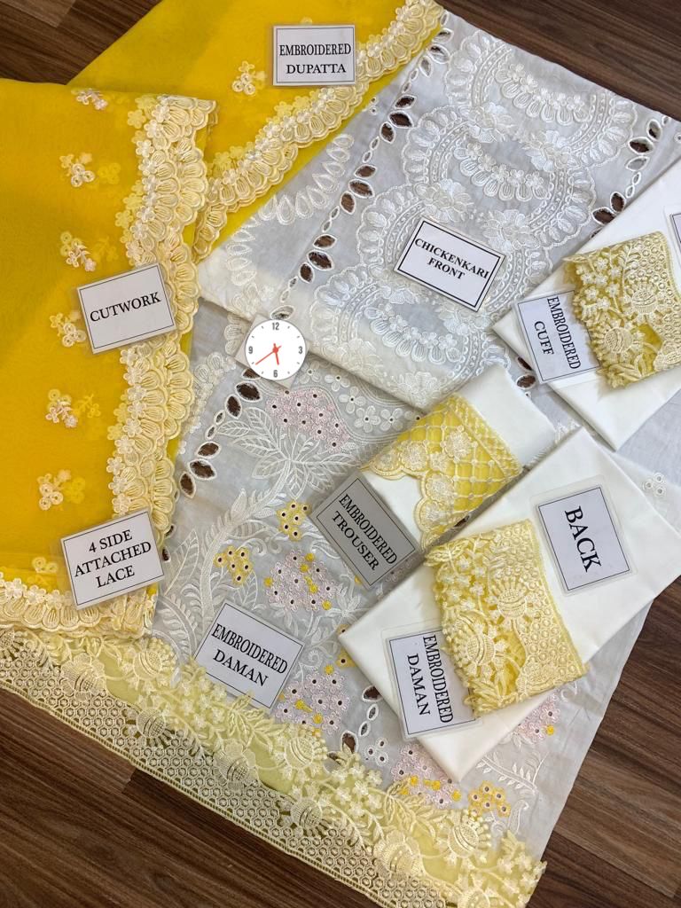 PREMIUM LAWN WITH FULLY HEAVY ALTERNET EMBROIDERED FRONT EMBELISH WITH KAYA CUTWORK AS IN MODEL