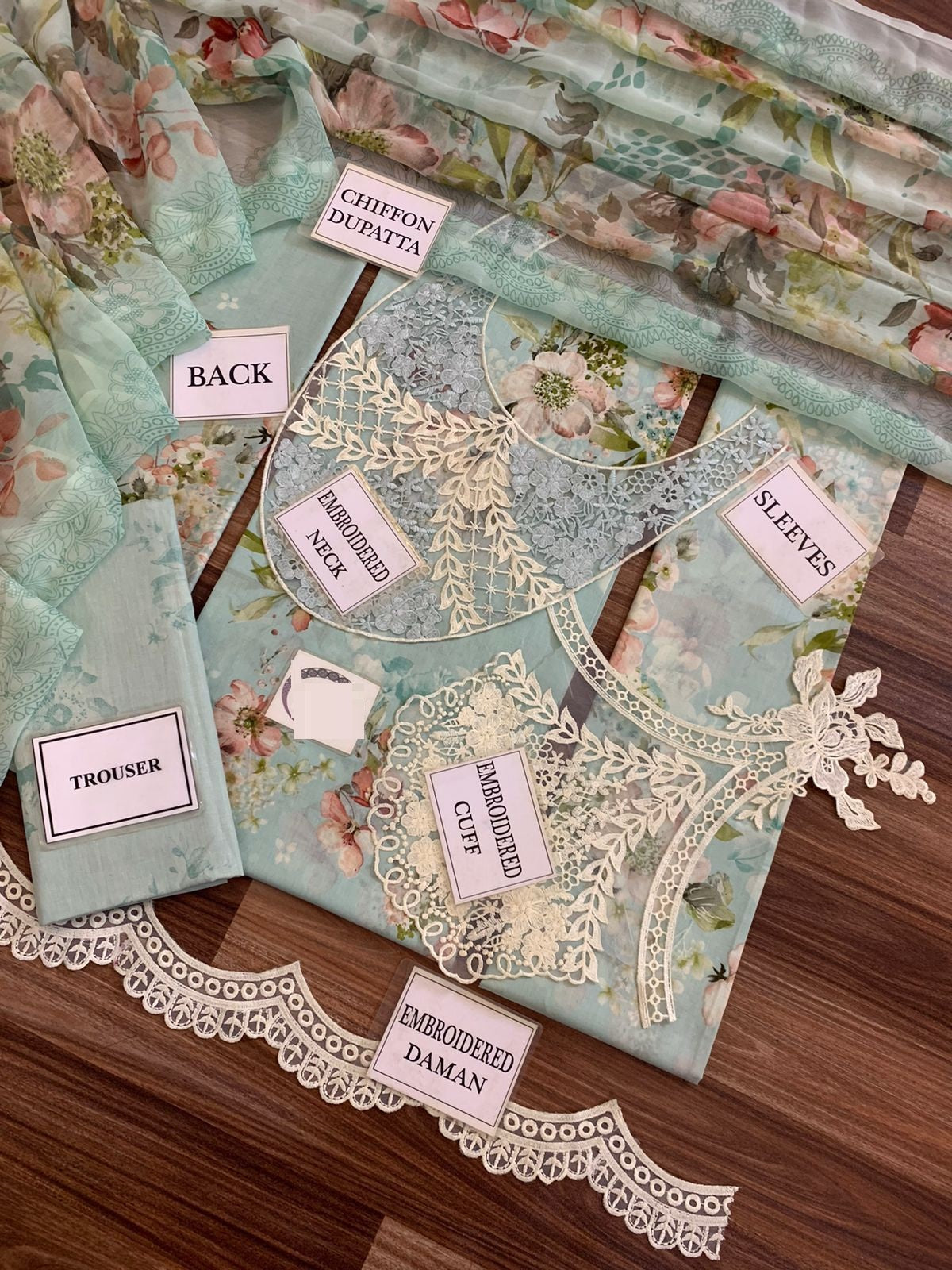 Printed lawn front with heavy embroidered spengle work neck patch & heavy daman boarder