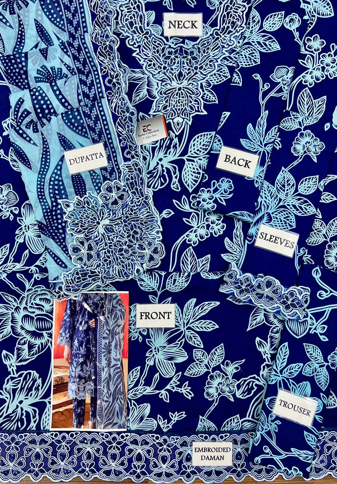 printed lawn front with heavy embroidered spengle work neckline with heavy embroidered spengle work daman boarder attach